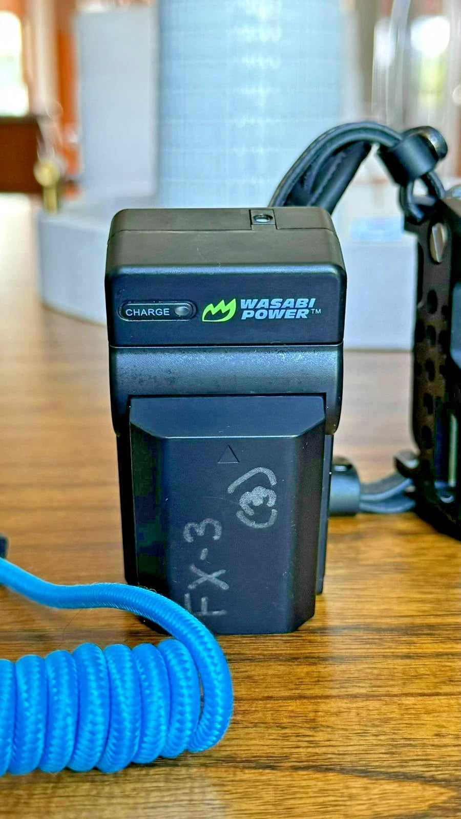 Wasabi Power NP-FZ100 Compatible Battery with Dummy Adapter: Extended power solution with coiled blue USB cable for dummy battery setup, allowing continuous shooting via external power banks or V-mount (not included).